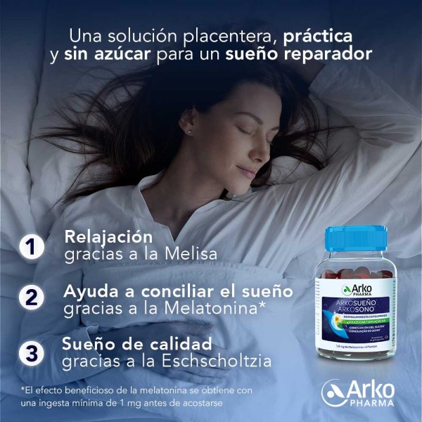 Los deliciosos caramelos de goma sin azúcar Arkosueño® Dormigummies están especialmente pensados para ayudar a reducir el tiempo de conciliación del sueño gracias su fórmula con 1,9 mg de Melatonina* + 3 plantas: Melisa, Amapola de California y Tila.