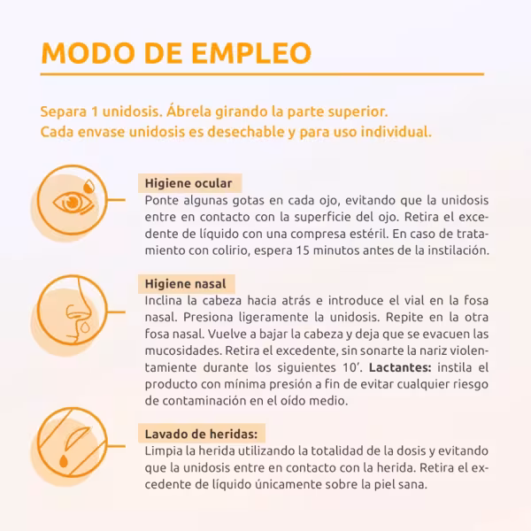 2. Recuerda que cada envase unidosis es desechable y para uso individual.Para la higiene ocular: Ponte algunas gotas de solución en cada ojo, evitando que la unidosis entre en contacto con la superficie del ojo. Retira el excedente de líquido con una compresa estéril. En caso de tratamiento con colirio, espera 15 minutos antes de la instilación.Para la higiene nasal: Inclina la cabeza hacia atrás. Introduce delicadamente el vial en la fosa nasal y presiona ligeramente la unidosis. Repite la operación en la otra fosa nasal. Vuelve a bajar la cabeza para dejar que se evacuen las mucosidades y después retira el excedente. No te suenes la nariz violentamiente durante 10 minutos después de la administración. En los lactantes, instila el producto con mínima presión a fin de evitar cualquier riesgo de contaminación en el oído medio.Para el lavado de heridas: Limpia la herida utilizando la totalidad de la dosis y evitando que la unidosis entre en contacto con la herida. Retira el excedente de líquido únicamente sobre la piel sana.